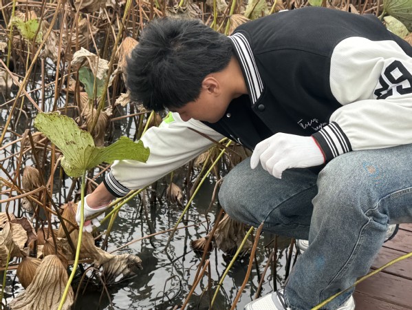 掌握理论知识后,新生们领取工具分组行动。在福寿螺防治区,他们俯身仔细检查水生植物,精准夹取淡粉色卵块放入收集桶,小心剥离岸边石块上的成螺并统一收纳,负责药物投放的学生严格按规范洒药,从源头抑制福寿螺繁殖。针对加拿大一枝黄花,新生们先精准识别,再分工清理,幼苗合力拔除,高大植株用铲子深挖根系,教师全程指导,强调将清理植株装入密封袋防二次入侵。