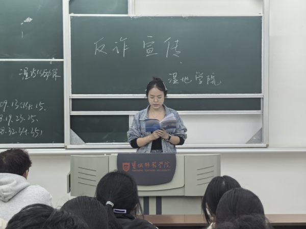 为深入贯彻落实校园安全治理工作要求,切实提升青年学子识骗防骗意识与能力,近日,湿地学院以“普及反诈知识,守护财产安全”为核心,开展为期一周的“反诈宣传进课堂”主题教育活动,为全院学生送上一堂兼具实用性与指导性的反诈“必修课”,以精准宣传筑牢校园安全防护屏障。