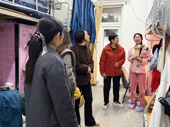 走访过程中,宋燕萍一行逐一走进各间宿舍,详细询问大家新学期课程学习进度、日常作息规律、宿舍生活适应状态及未来学业发展规划等情况,耐心倾听同学们在学习困惑、生活需求、宿舍管理等方面的实际问题与诉求。同时,老师们重点检查了宿舍环境卫生、内务整理规范、安全用电情况及基础设施保障状况,叮嘱同学们严守宿舍安全规章制度,养成良好生活习惯,营造整洁、文明、和谐的宿舍氛围。