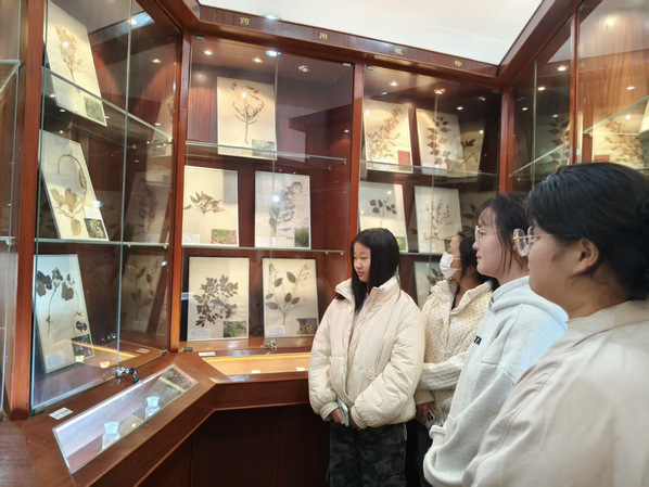 第二站,师生们走进学院植物标本馆。玻璃展柜中,数百份湿地植物腊叶标本整齐陈列,历经专业压制与保存,叶片脉络清晰可见、花果形态完整如初。从芦苇、碱蓬等滨海常见草本,到珍稀濒危的湿地木本植物,标本完整呈现了黄海湿地植物群落的物种多样性、生态适应性与演化脉络。同学们俯身细观、认真研读,在方寸标本间读懂草木枯荣的生命节律,触摸湿地生态的原真底色。此次近距离观摩,不仅夯实了植物分类、湿地生态等专业知识基础,更让学子们深刻体会到生物标本作为“生态档案”的科学价值与守护湿地基因库的时代使命。