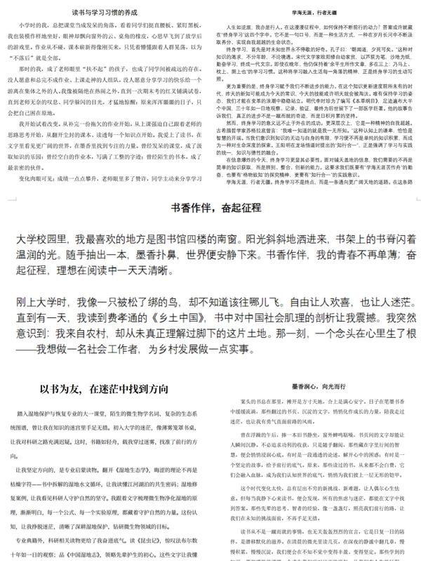 为扎实推进“学风建设月”走深走实,依托一站式学生社区深化文化育人、学风育人成效,近日,湿地学院举办“书香做伴,奋起征程”主题征文活动。活动立足学生社区育人阵地,以笔墨传情、以书香润心,将学风建设融入学生日常学习生活,着力营造勤学善思、笃行奋进的校园氛围,展现青年学子昂扬向上的青春风采。